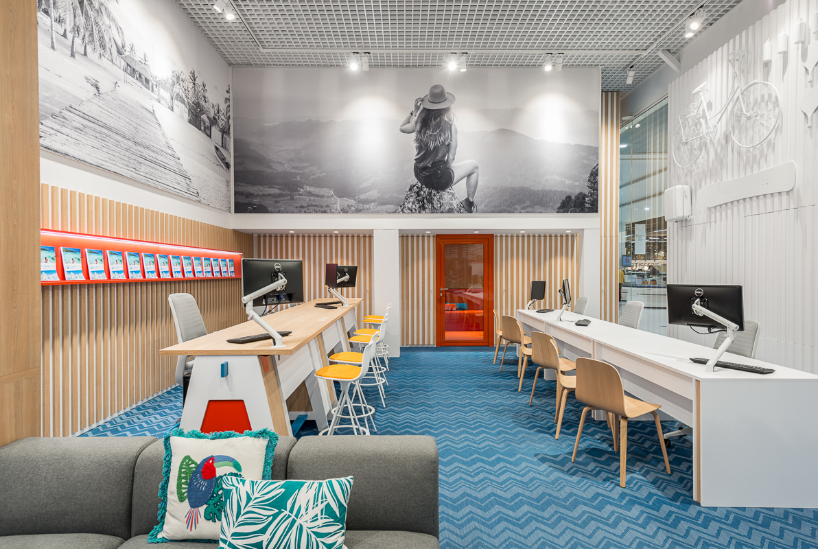 Le projet majeur consistait à concevoir une agence repensée par l’Agence Decoheure pour E.Leclerc, centrée sur l’univers du voyage. Cette boutique spécialisée présente une architecture géométrique et des couleurs énergisantes, offrant une variété de destinations à prix E.Leclerc dans un environnement riche en couleurs, formes, matériaux et lumières.