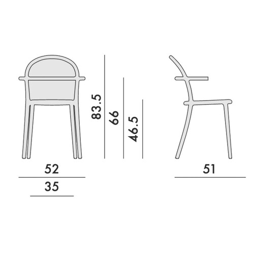 - Dimensions : L 52 x Prof 52 x H 83,5 cm – Assise : H 46 cm – Accoudoir : H 66 cm – Empilable (x 2) – Très léger et résistant – Assise ample et confortable