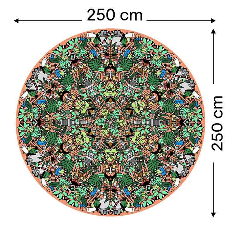 Véritable œuvre d’art au sol, ce tapis dévoile une profusion de motifs tribaux, de symboles puissants et d’éléments naturels, dans une composition joyeuse et foisonnante. Chaque détail est une invitation au voyage, entre tradition ancestrale et modernité assumée.